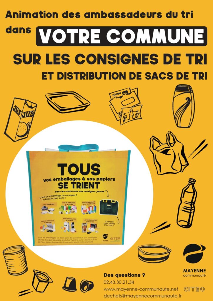Lors de ces animations, les nouveaux sacs de tri de Mayenne Communauté seront distribués.