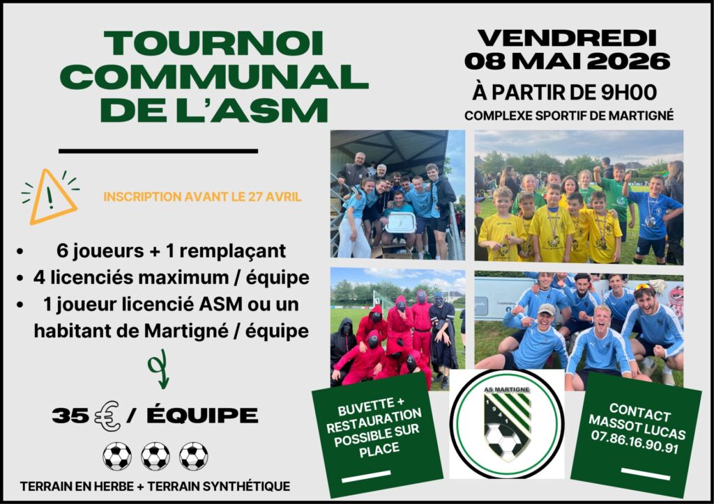 L’ ASM organise un tournoi de football le vendredi 08 mai 2026 à partir de 9h00 au complexe sportif de Martigné.